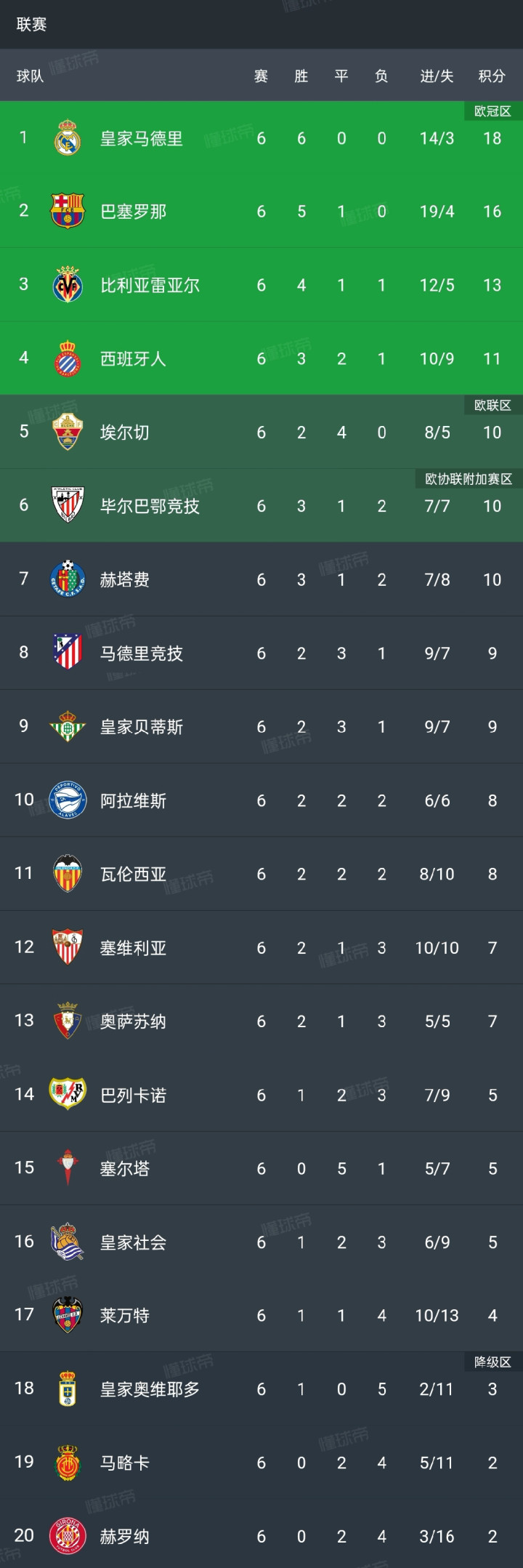 皇家马德里六连胜积18分,以2分的优势领跑。