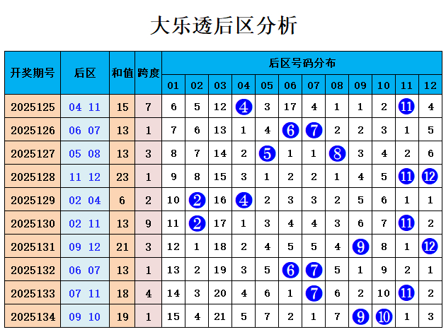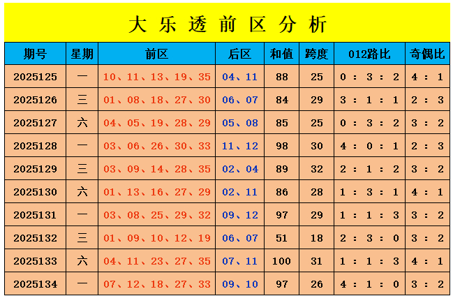 上期回顾:大乐透第2025134期奖号为:前区07、12、18、27、33,后区09、10,前区奖号012路比为4:1:0,奇偶比为3:2,后区开出0路、1路组合09、10