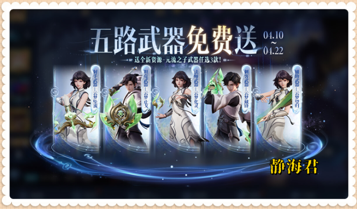 在新版本更新完成后,到4月22日截止,玩家可以通过大厅→活动→世界启程→送元流武器的途径,参与到五路武器免费送的活动中来。