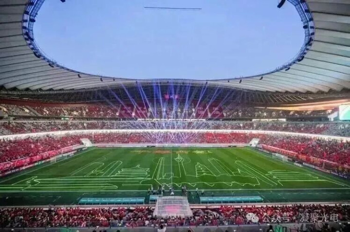 在本次比赛开始前,一场由西安凝聚光电科技有限公司助力呈现的灯光秀惊艳全场,为这座场馆的首秀增添了浓墨重彩的一笔。夜幕低垂,在激光技术的加持下,整个足球场瞬间成为光影交织的梦幻空间。“千年古都 常来长安”八个大字在绿茵场上闪烁生辉,彰显着西安的热情与底蕴。紧接着,璀璨激光如星河般倾泻而下,光影编织出大雁塔、钟楼、兵马俑等西安标志性建筑,这些承载着千年历史的符号在激光下灵动展现,与现代感十足的足球场形成奇妙的时空对话。