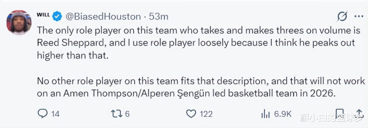 Will还表示,在目前的火箭 唯一能出手大量三分且命中的球员只有谢泼德,我认为他的上限不止于此,实际上他可以更强,这支球队没有球员有他这样的特质,只依靠阿门、申京是行不通的。