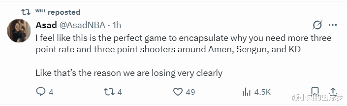 休媒Asad写道:我觉得这场比赛正好能说明为什么我们需要更多的投手来围绕阿门、申京、杜兰特等人,因为我们正在遭受三分球太差带来的损失。