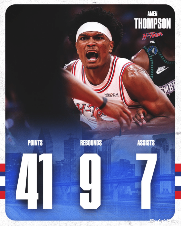 在阿门-汤普森打出生涯之夜时火箭还是输球了,阿门42分钟,22中17,命中率高达77.3%,全场比赛暴扣8次,拿到41分9篮板7助攻2抢断,得分创造生涯新高,也是生涯首次40+,可在一场对攻大战还是无法击败残阵森林狼。