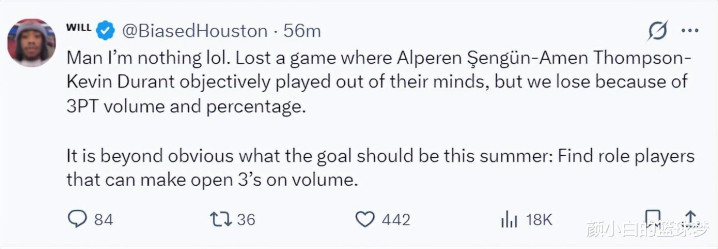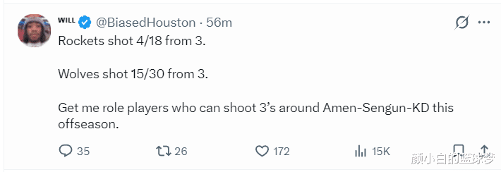 火箭记者Will写道:森林狼全场三分30中15,而火箭三分球18中4,请在休赛期围绕阿门、申京、杜兰特补强能投进三分球的球员。(乌度卡也在赛后表示这场比赛失利的关键就是三分球无法命中)
