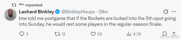 火箭队记兰德里-宾克利写道:这场比赛之前乌度卡告诉我,一旦火箭只能排第五无缘升至第四,那么火箭队会在最后一场常规赛轮休全部的主力球员。