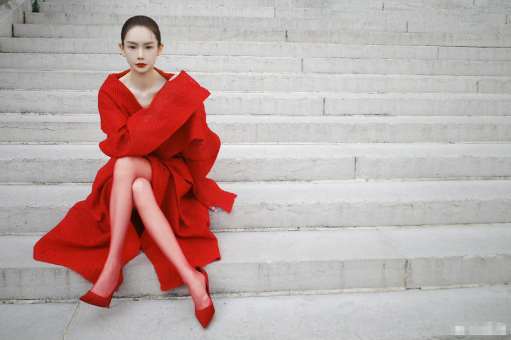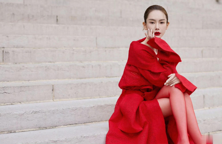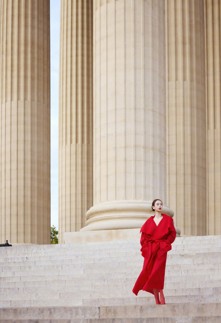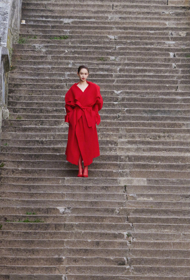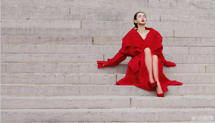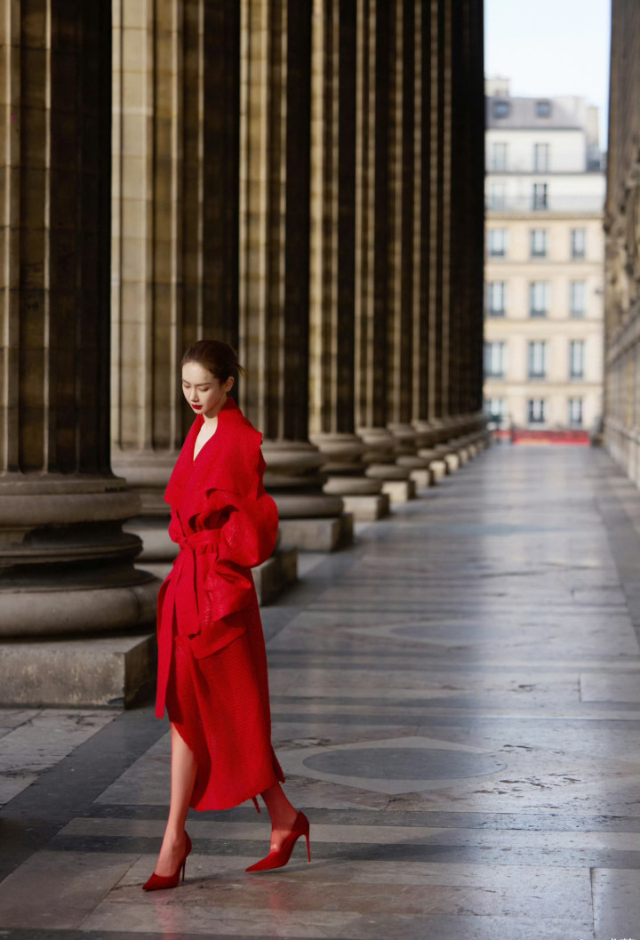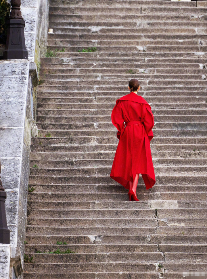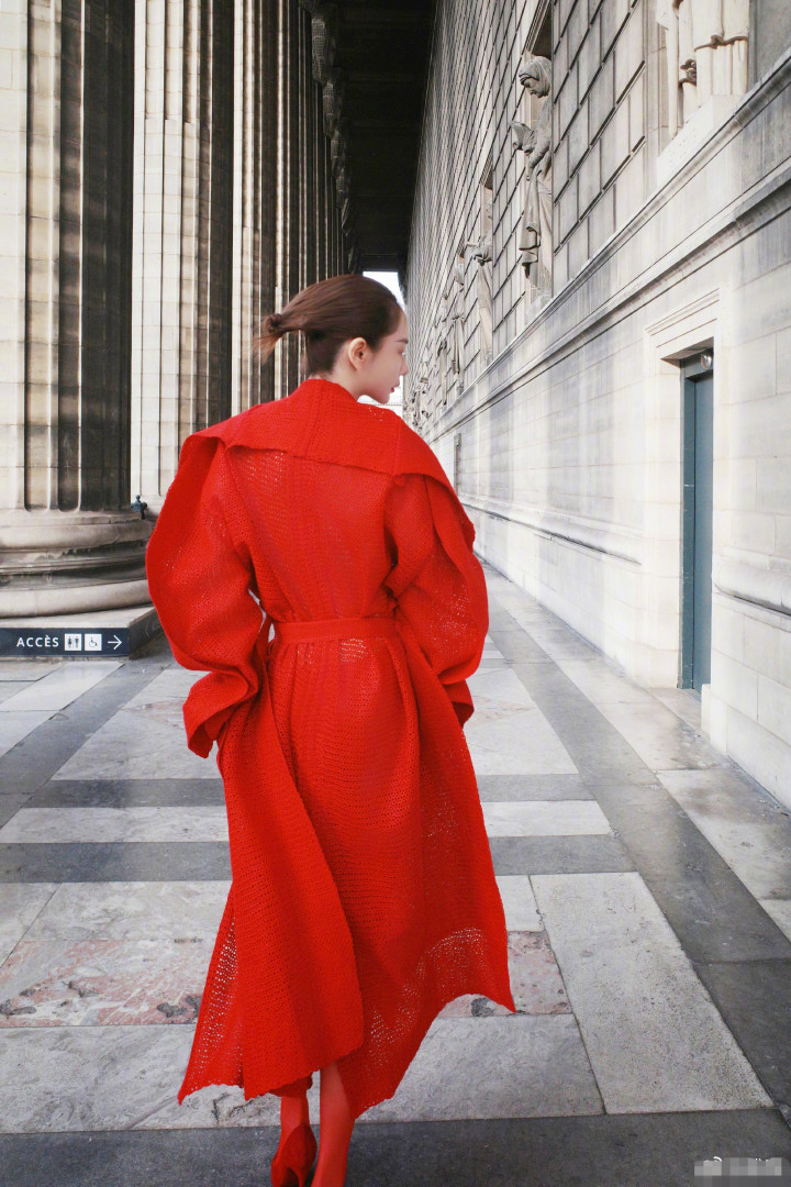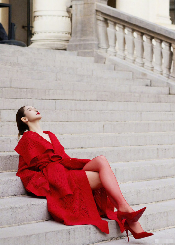 戚薇巴黎时装周造型曝光,红色大衣搭配红鞋子和红丝袜,一身清冷的红魅惑撩人。